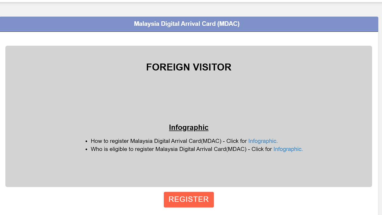 웹사이트에 접속 후, "Register" 버튼을 클릭하여 말레이시아 입국신고서 작성을 시작합니다. 이때 여권 번호, 항공편 정보, 숙소 주소 등 기본적인 여행 정보를 준비해두면 작성이 더 수월합니다.