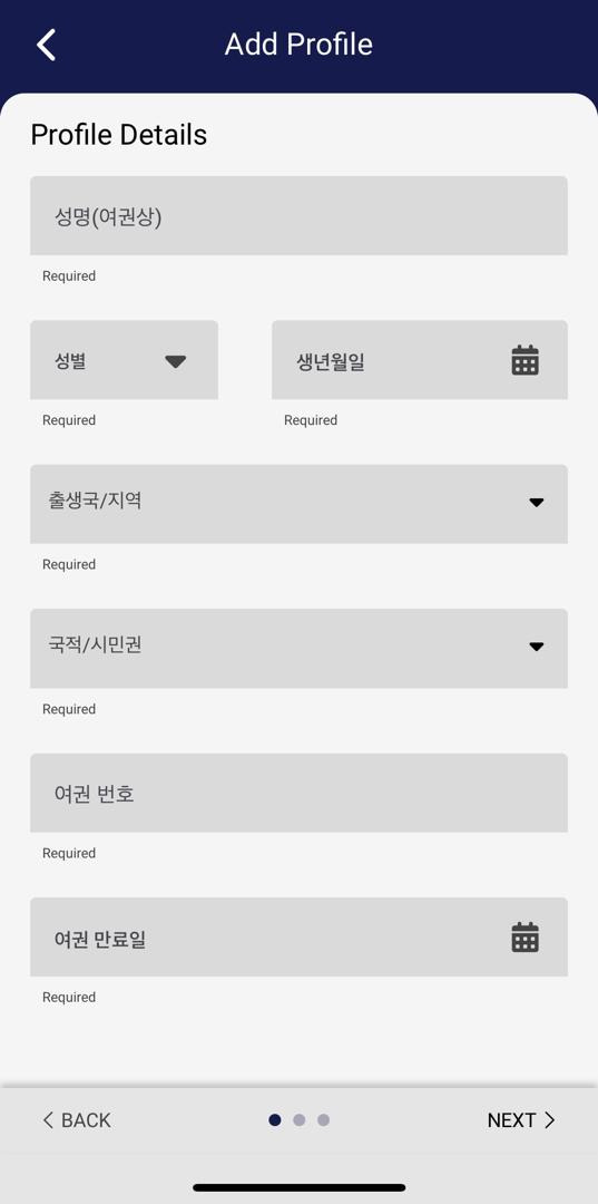 *여권 정보를 기입할 때 철자와 정보가 정확하게 입력되어야 합니다. 잘못된 정보를 입력하면 입국 심사 시 프로필 및 입국 신고서 재작성 요청을 받을 수 있으니 반드시 정확하게 확인하세요.