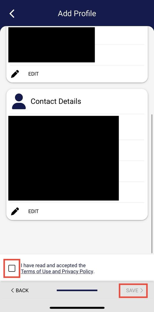 7) 입력된 정보가 정확한지 확인한 후, 왼쪽 하단의 체크박스를 클릭하고, 오른쪽 하단의 'SAVE' 버튼을 클릭하여 완료합니다.
