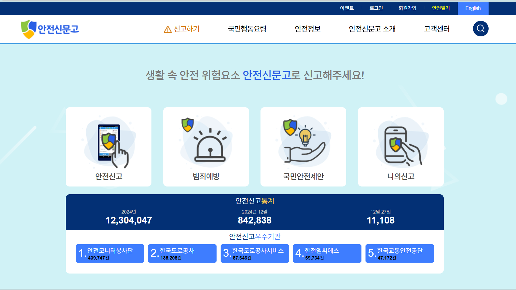 안전신문고 홈페이지에 접속한 후, "신고하기" 버튼을 클릭합니다.