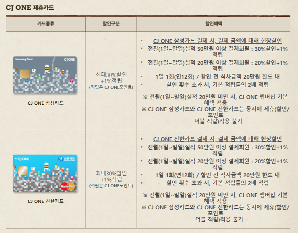 | 기타 제휴 혜택 | CJ ONE 멤버십 | 결제 금액의 0.5~1% 적립 | 1,000 이상 사용 가능 |